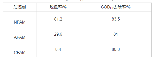 在上述最佳條件下,3組水樣分別投加1mL的陰離子型聚丙烯酰胺(APAM)、陽(yáng)離子型聚丙烯酰胺(CPAM)、非離子型聚丙烯酰胺(NPAM),(3種助凝劑濃度均為0.5%) , 300r/min快速攪拌1min, 90r/min慢速攪拌10min, 靜止沉降15 min, 結(jié)果見(jiàn)表。